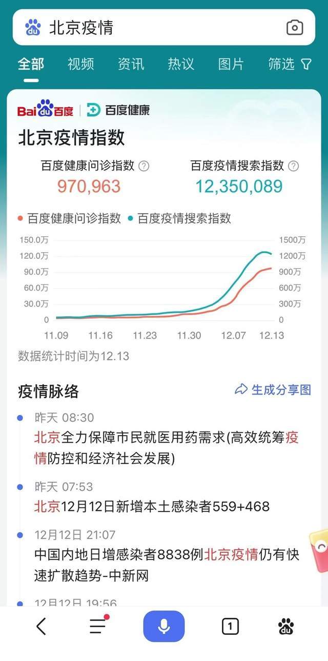 据悉,百度疫情指数包括百度疫情搜索指数和百度健康问诊指数两大数据维度。百度疫情搜索指数反映了大众对新冠症状、防疫物资等需求的搜索关注程度与持续变化情况,百度健康问诊指数通过统计当地互联网用户在百度健康使用呼吸内科问诊咨询量等数据,形成相关指数,帮助网民感知相关城市疫情走势,及时做好防护措施。在百度APP中,用户通过查询“地区名+疫情”等关键词,如“北京疫情”,即可了解疫情实时动态。